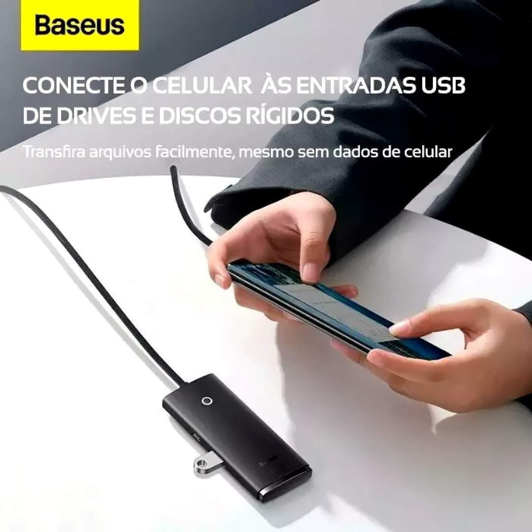 Transforme uma única entrada USB-C em 4 portas USB-A com o Hub Baseus Lite! Compacto, resistente e prático, é ideal para quem precisa conectar diversos dispositivos ao mesmo tempo. Seja para trabalho, estudos ou lazer, ele garante versatilidade e eficiência para o seu dia a dia.